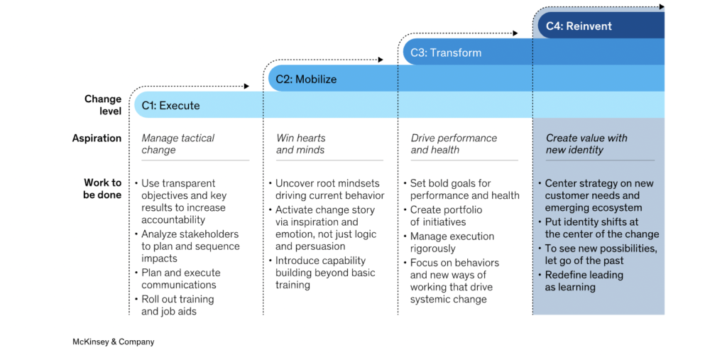 McKinsey propune un cadru conceptual care distinge patru niveluri diferite de schimbare, fiecare cu o complexitate și un impact distinct asupra organizației.